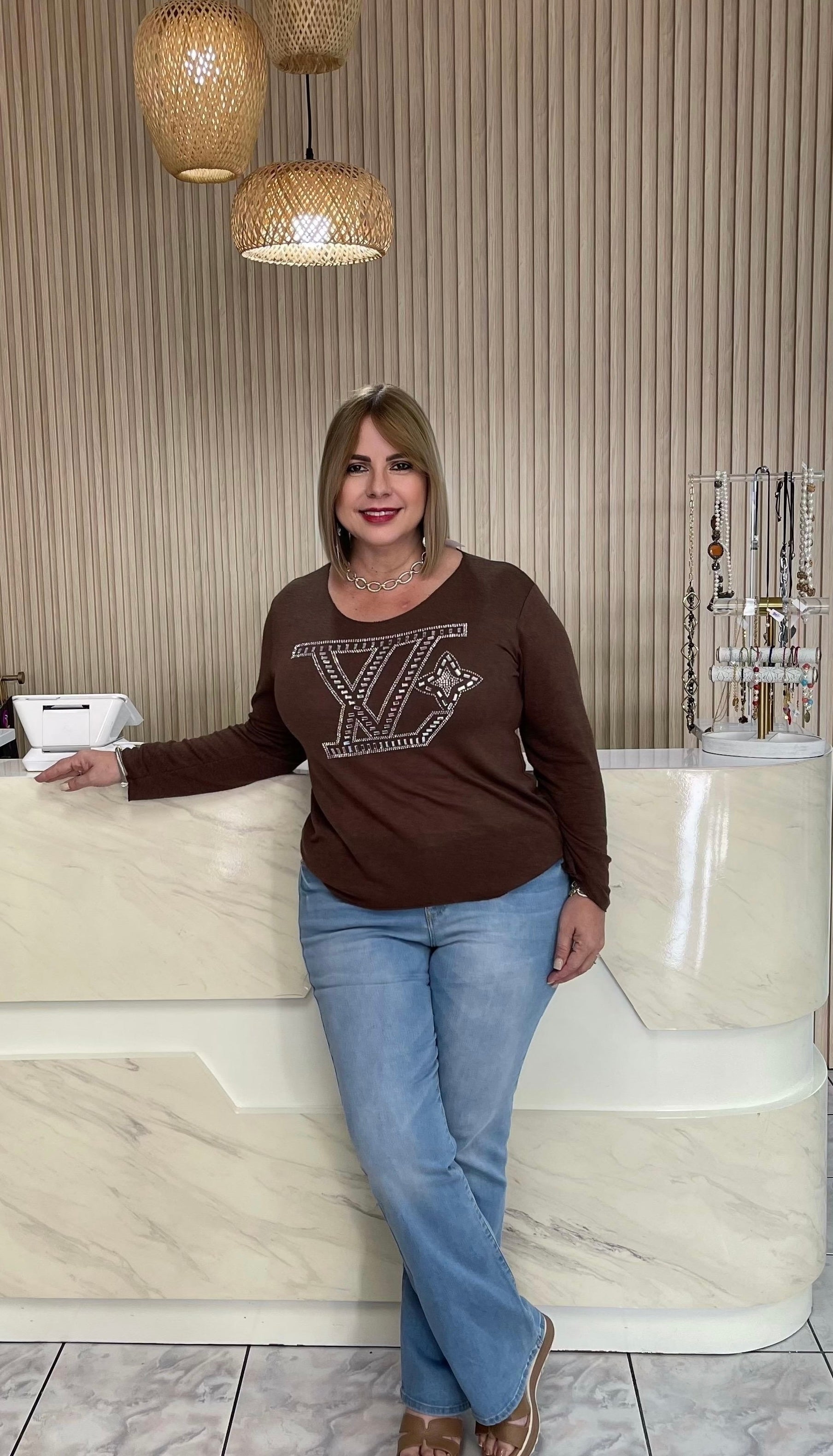 The Brown LV Italian Plus Top combines Italian craftsmanship with spandex for a comfortable fit. This top is designed for enhanced wearability, making it a versatile addition to any wardrobe. Its trending appeal positions it as a necessary choice for those seeking both style and functionality.